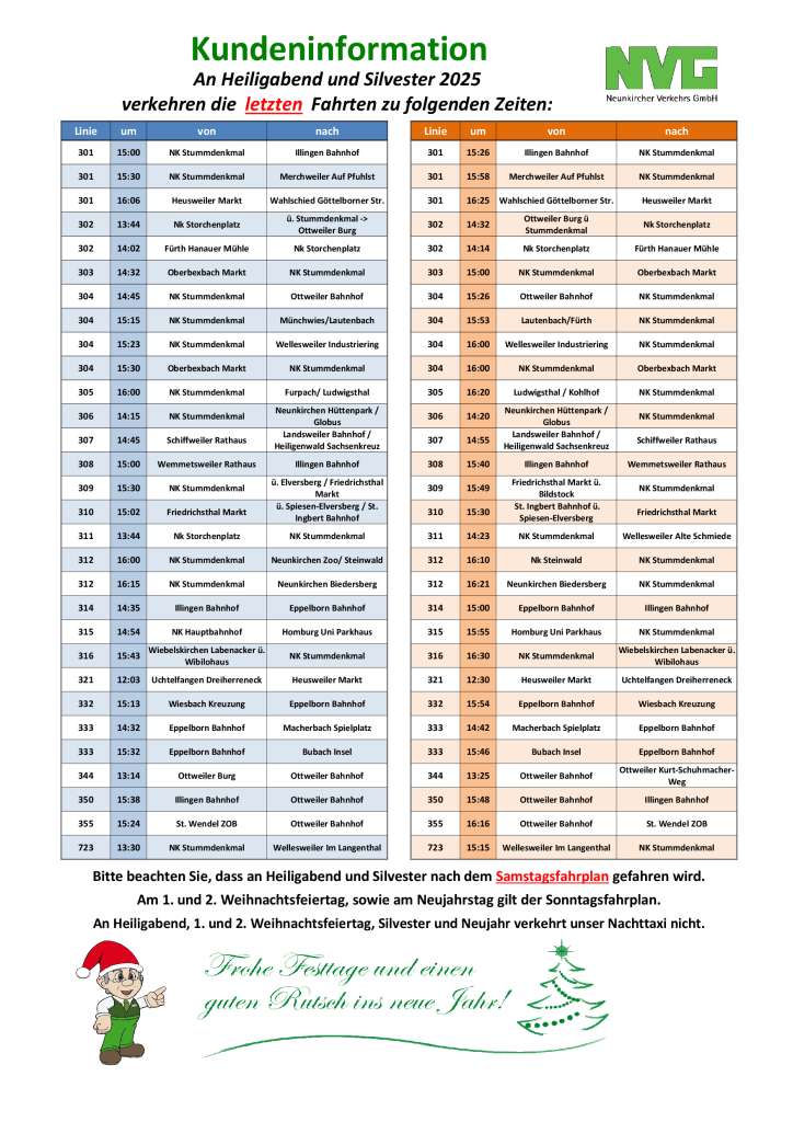 Bitte beachten Sie, dass an Heiligabend und Silvester nach dem Samstagsfahrplan gefahren wird.